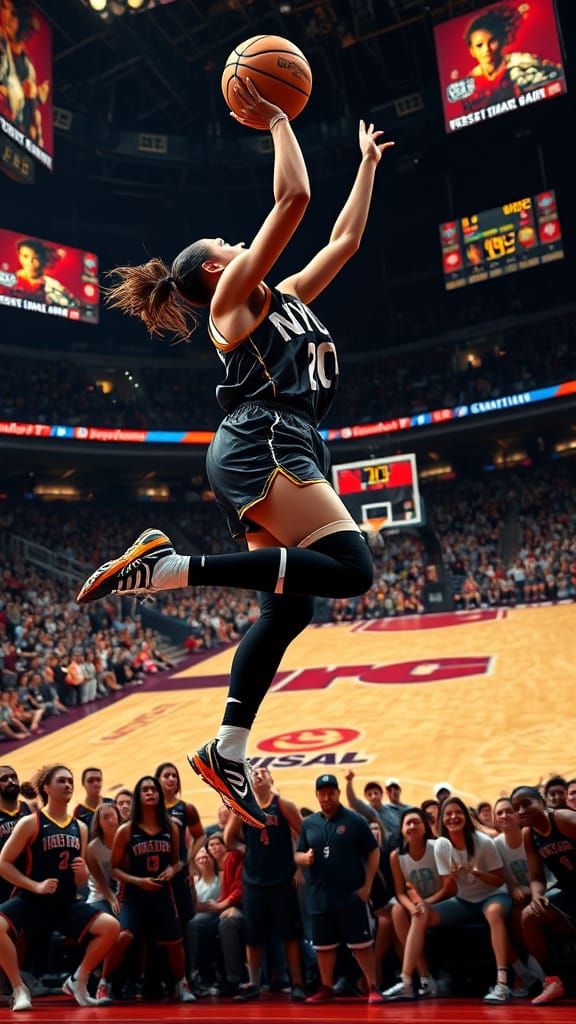 This image shows a woman basketball player taking a jump shot at a game in Madison Square Garden. The player is wearing a shiny uniform and the crowd is cheering in this dynamic, detailed digital art.