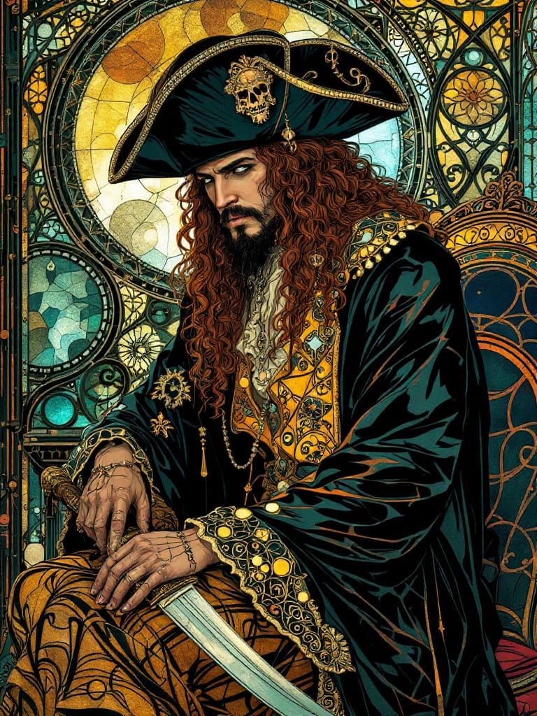This image shows a pirate portrait with jewel-toned, translucent colors and intricate curvilinear embellishments. It features luminous atmospheric depth with metallic gradients and a polished enamel finish.