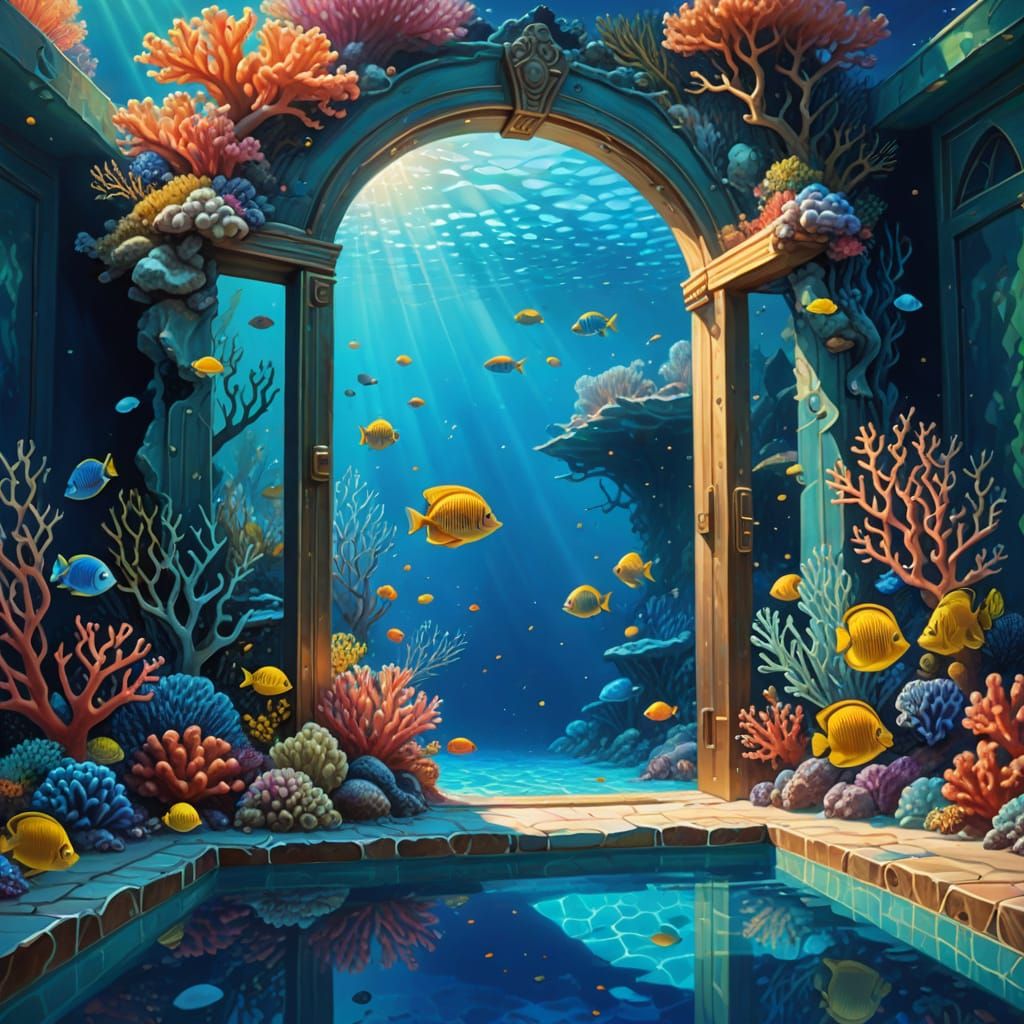 A vibrant oil painting shows an underwater doorway from a blue pool to a colorful coral reef. Fish swim by in this detailed, dreamlike 3D rendering.