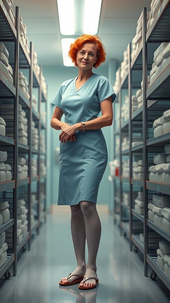 A striking picture of a tall, slender nurse with vibrant red curly hair in a retro hospital room. The portrait uses dramatic lighting and hyper-realistic details with elegant lines, reminiscent of splash art.