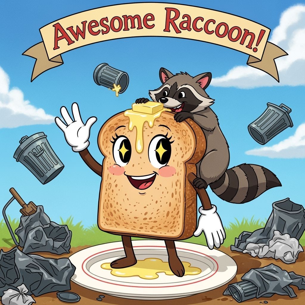 This image shows an animated rye toast character being eaten by a raccoon. The scene is vibrant and whimsical, in a style reminiscent of animated fantasy art.