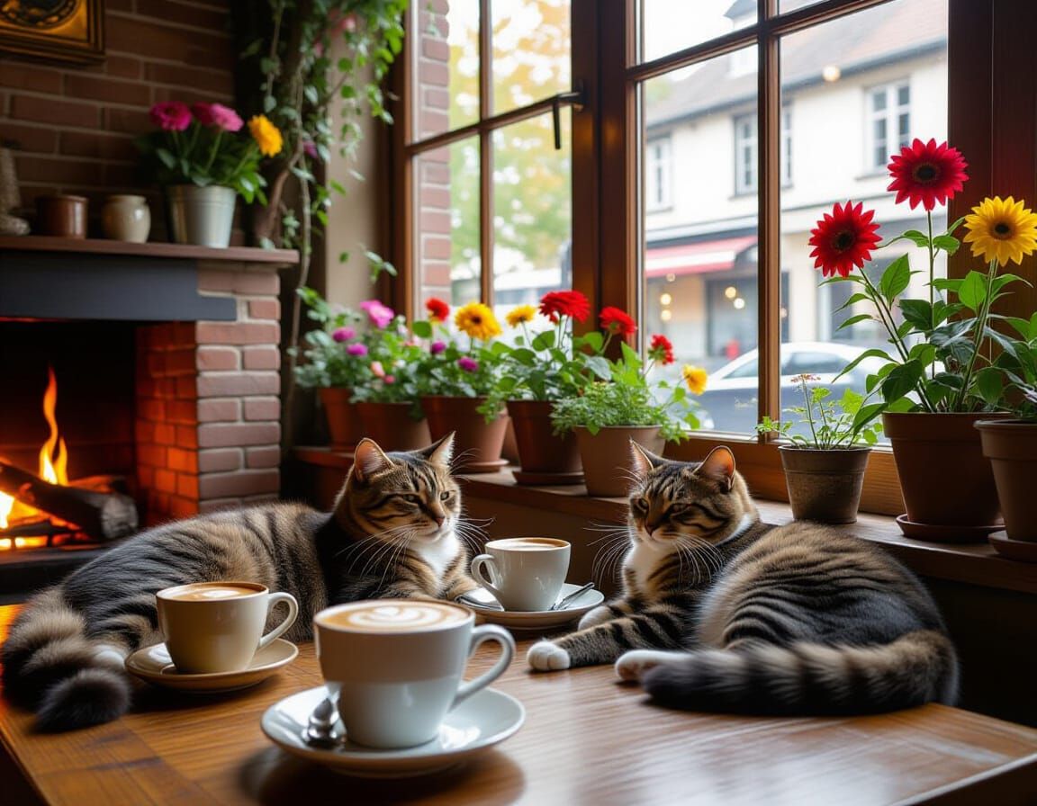 A cinematic image of cats relaxing in a cozy village cafe, filled with flowers, food, and steaming coffee. The scene is bathed in dramatic lighting with subtle film grain.