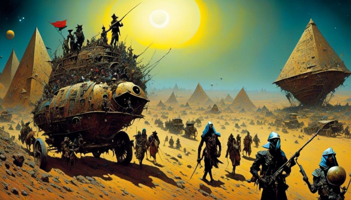 A surreal image of Israelites in forced labor. The scene shows them building pyramids in a deep desert. The artwork is reminiscent of dark surrealist illustration.