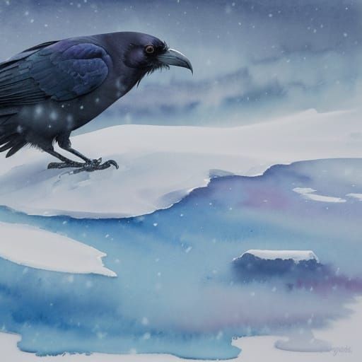 This image features a raven perched on snow, rendered with vibrant watercolor and oil textures. Atmospheric lighting and soft edges create a moody, detailed winter scene.