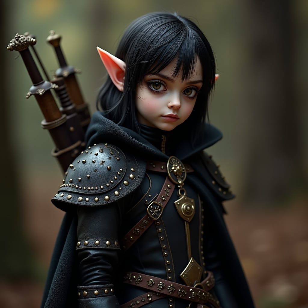 This captivating portrait of a mysterious female halfling showcases her striking contrast of dark hair and pale complexion, illuminated by soft, golden studio lighting. The subtle bokeh effect and sharp focus create a captivating, professional image.