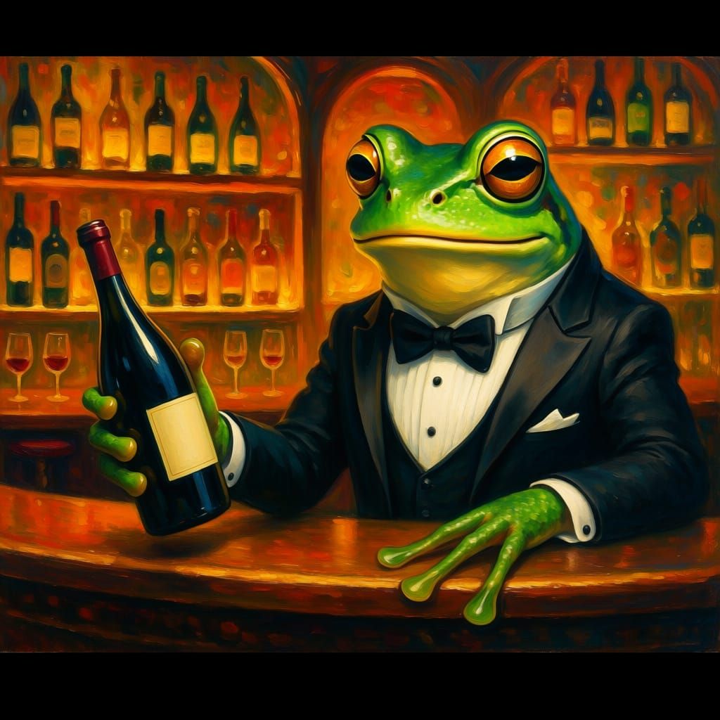 This image shows an anthropomorphic frog in a tuxedo, offering wine in a fancy bar. The style is impressionist oil on canvas, detailed and fantastical.