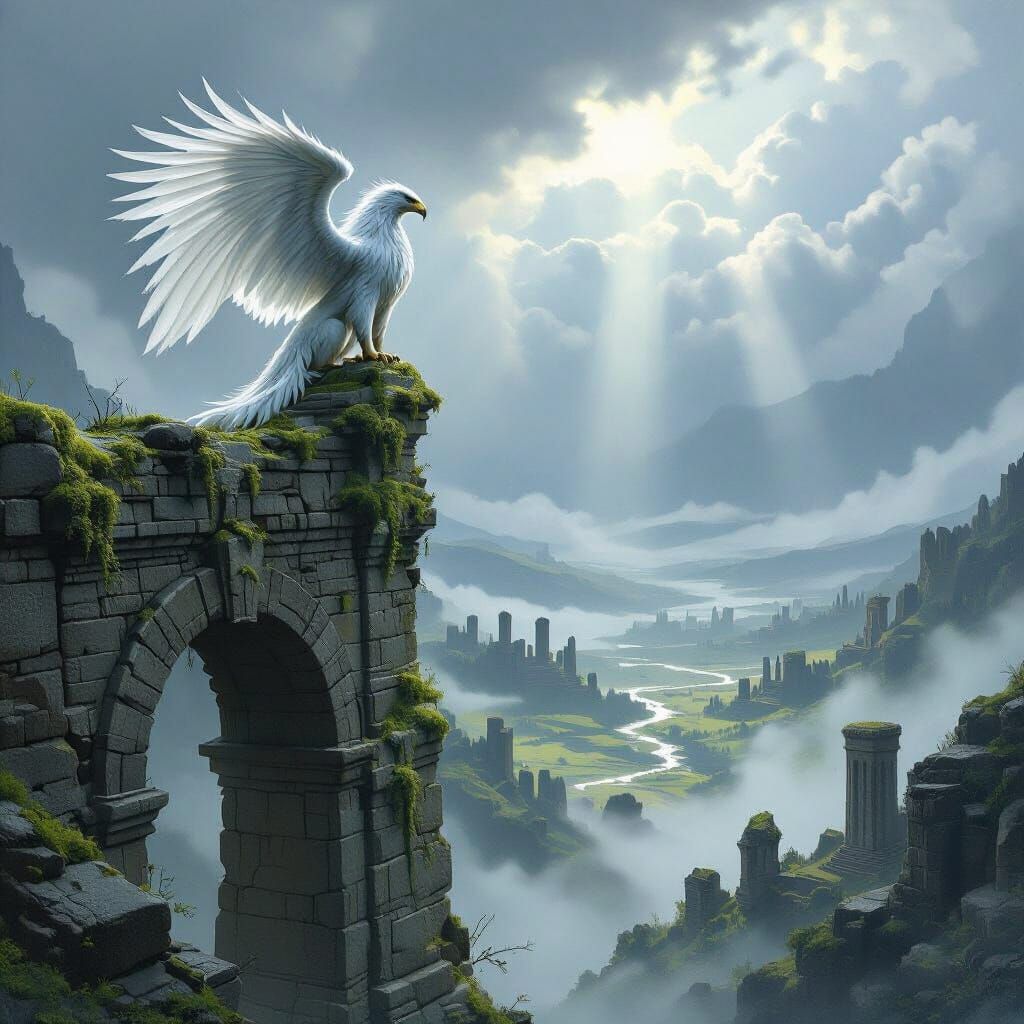 Epic fantasy concept art depicts a griffin on an ancient aqueduct overlooking a misty valley with ruins. Dramatic skies and painterly textures create a melancholic atmosphere.