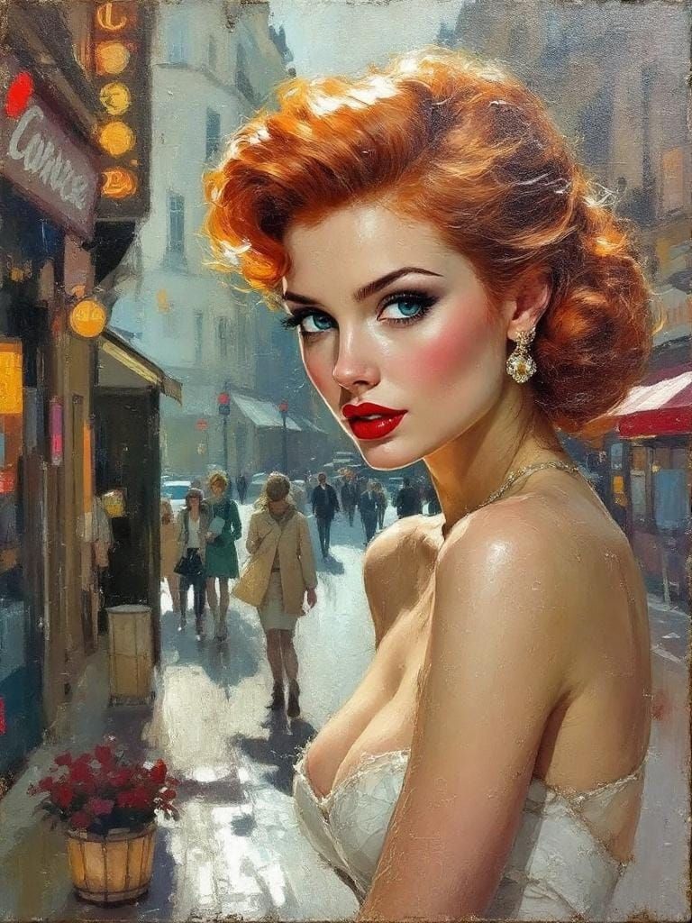 This image showcases a redhead in a classic pin-up pose on a Paris street, rendered with impressionist light and urban perspectives. The encaustic wax technique creates dimensional textures.