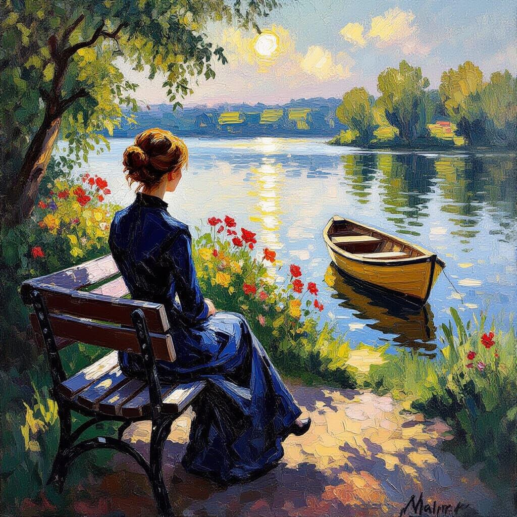 A vibrant impressionist garden scene featuring a solitary woman seated on a bench. The image captures the essence of the golden hour with a rich impasto technique.