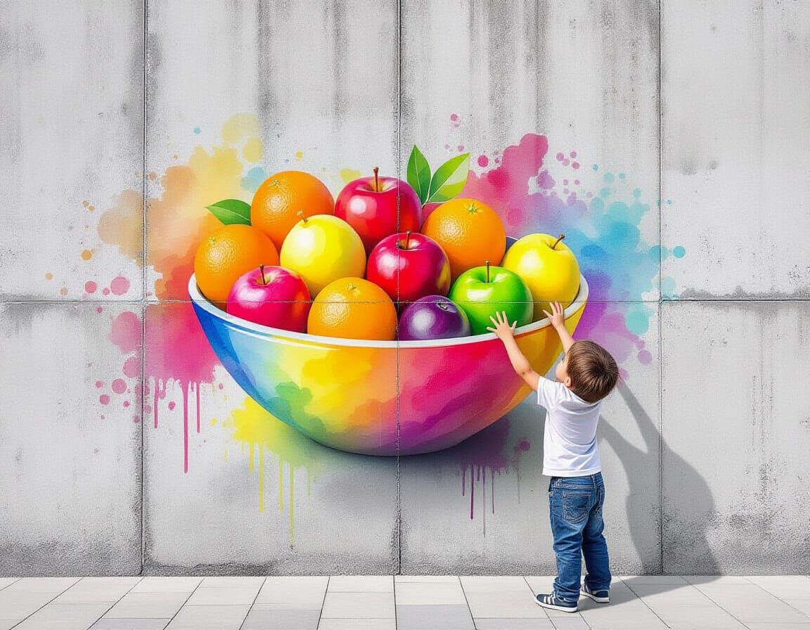 This image shows vibrant graffiti art on a grey concrete building wall. A colorful fruit bowl is spray painted, with a small boy reaching for it in this high contrast urban scene rendered as a watercolor painting.
