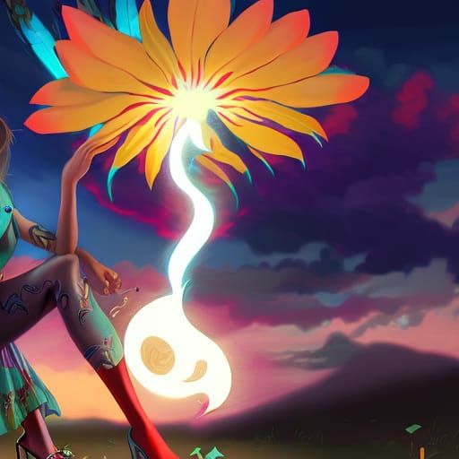 A digital painting of a girl in a vibrant skirt and sneakers, gazing at a moonflower. In the background, a car burns in the sky. The image is rendered with dynamic lighting and deep colors.