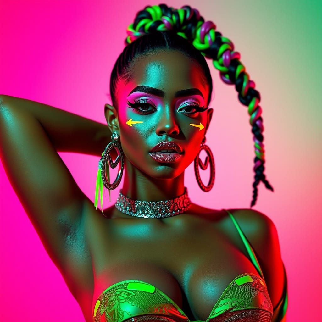 This image shows a woman in bold, colorful makeup and clothing, reminiscent of a vibrant club scene. The aesthetic is hyperreal and highly detailed, with a focus on energy and confidence.