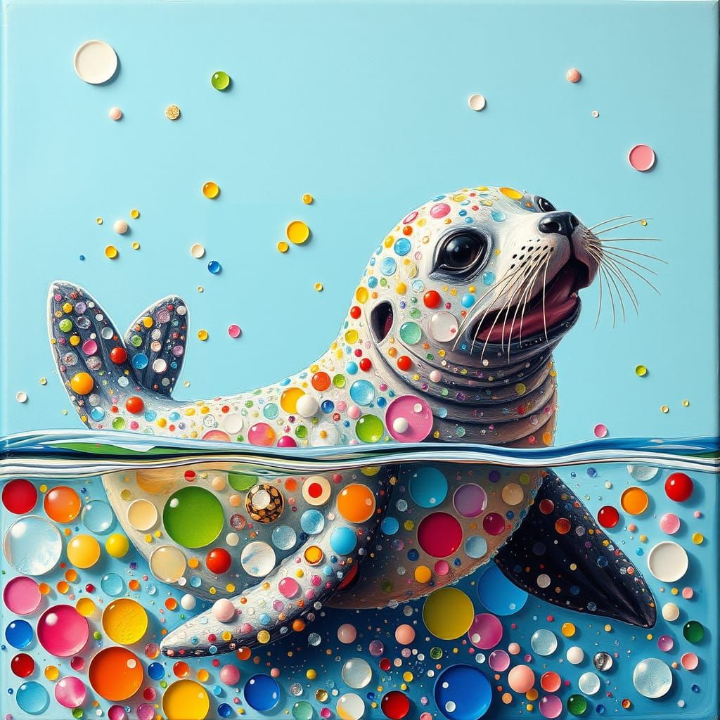 This image shows a puppy formed from vibrant bubbles and water. It features an organic sculptural style with intricate details and a playful, kitschy aesthetic.