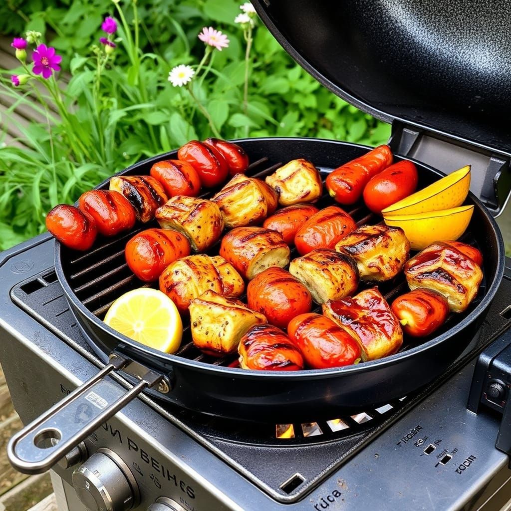 This image shows a colorful assortment of grilled foods perfect for a summer barbecue. The vibrant colors and appetizing presentation make it ideal for food-related content.