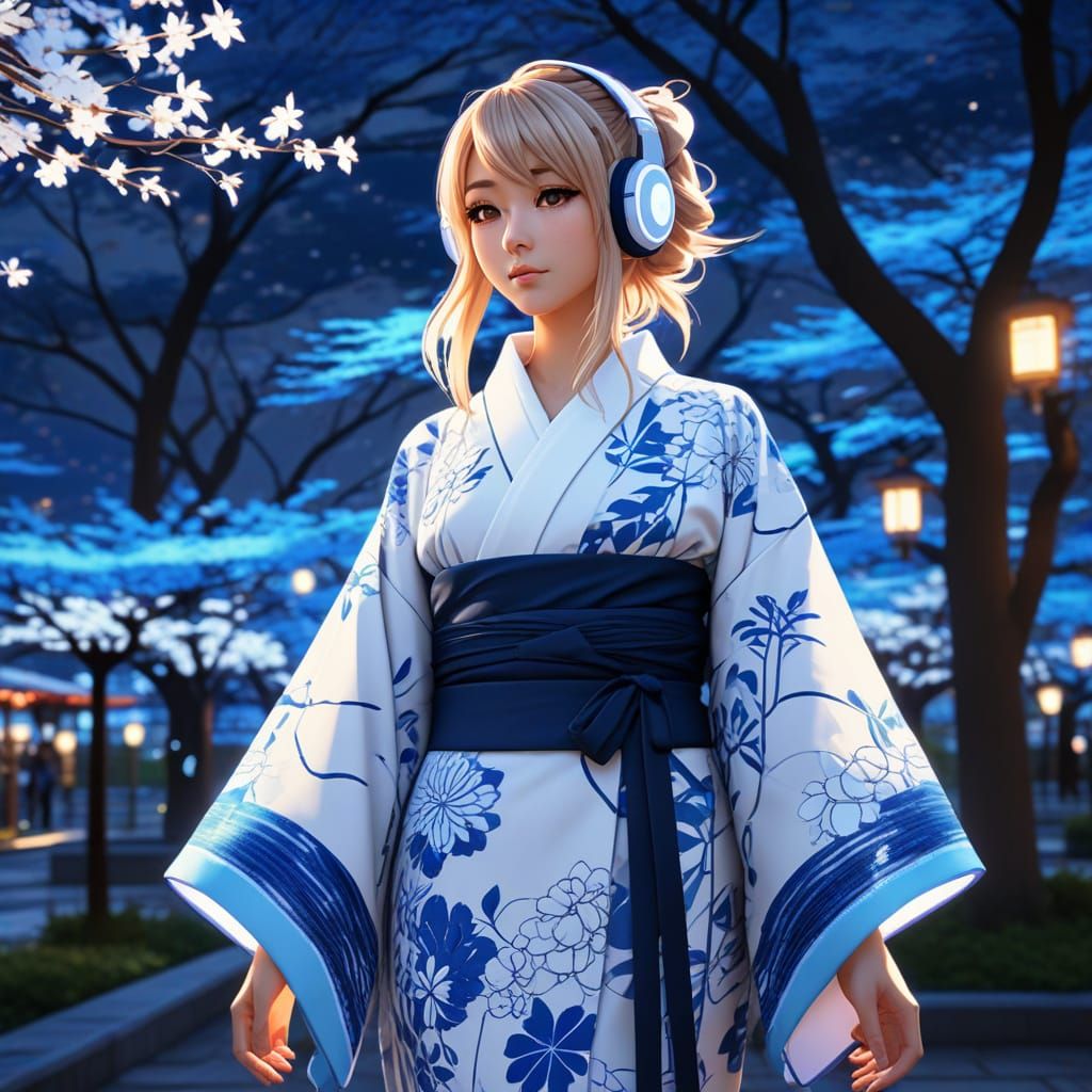 This image shows a gyaru girl in a vibrant kimono walking through a park while listening to music. The anime-style digital art features a cel-shaded manga aesthetic with cinematic lighting.