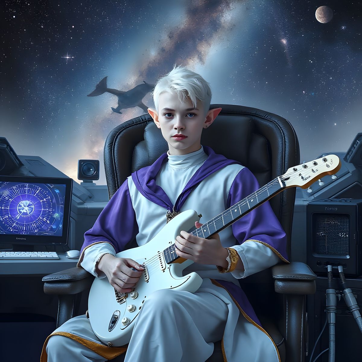 This image shows a young, handsome elf-man with pointy ears, wearing white and purple robes, surrounded by time travel technology and celestial elements, set against a stormy night sky with the Milky Way and zodiac constellations.