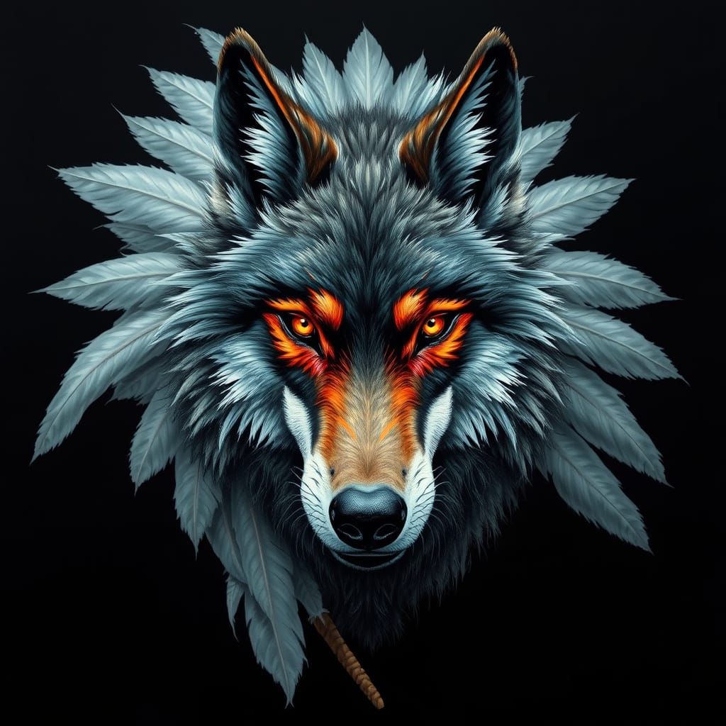 A striking picture of a spirit wolf with copper eyes emerging from a large white feather. The wolf is adorned with red ocher markings in a fantasy art style.