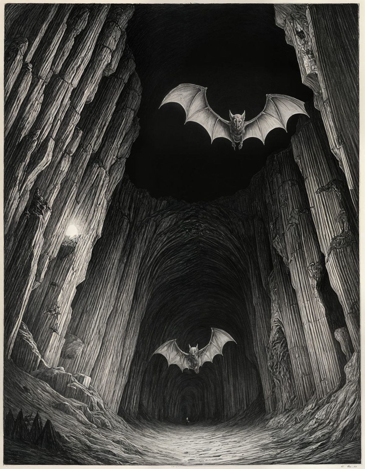 A black and white illustration of a cavern teeming with bat-like creatures. Tunnels disappear into darkness, creating a sinister and eerie atmosphere reminiscent of classic etchings.