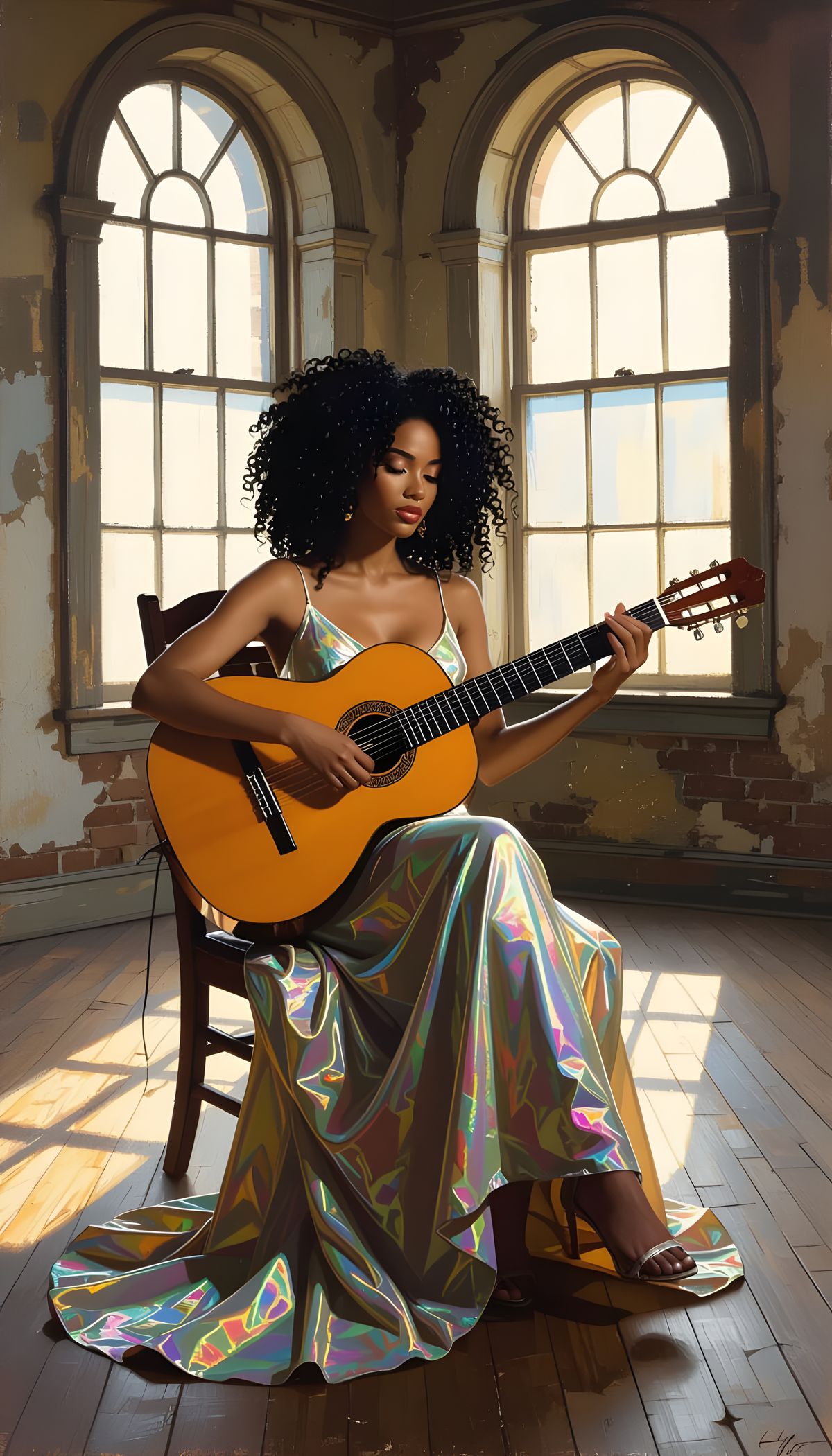 This oil on canvas painting depicts a beautiful Black woman with curly hair playing a classical guitar in an abandoned apartment. Dramatic lighting highlights her iridescent gown.