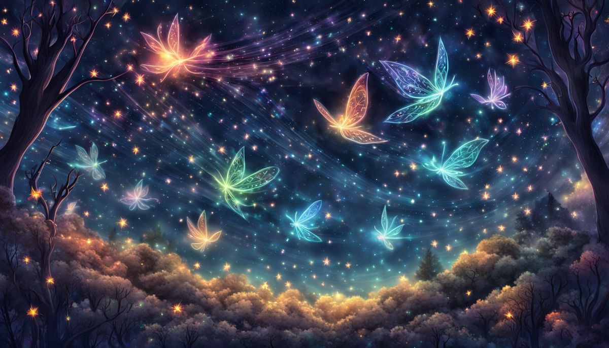 This enchanting image shows a group of glowing fairies flying in intricate patterns against a backdrop of a magical forest at night, with vibrant colors and subtle starlight adding to the mystical atmosphere.