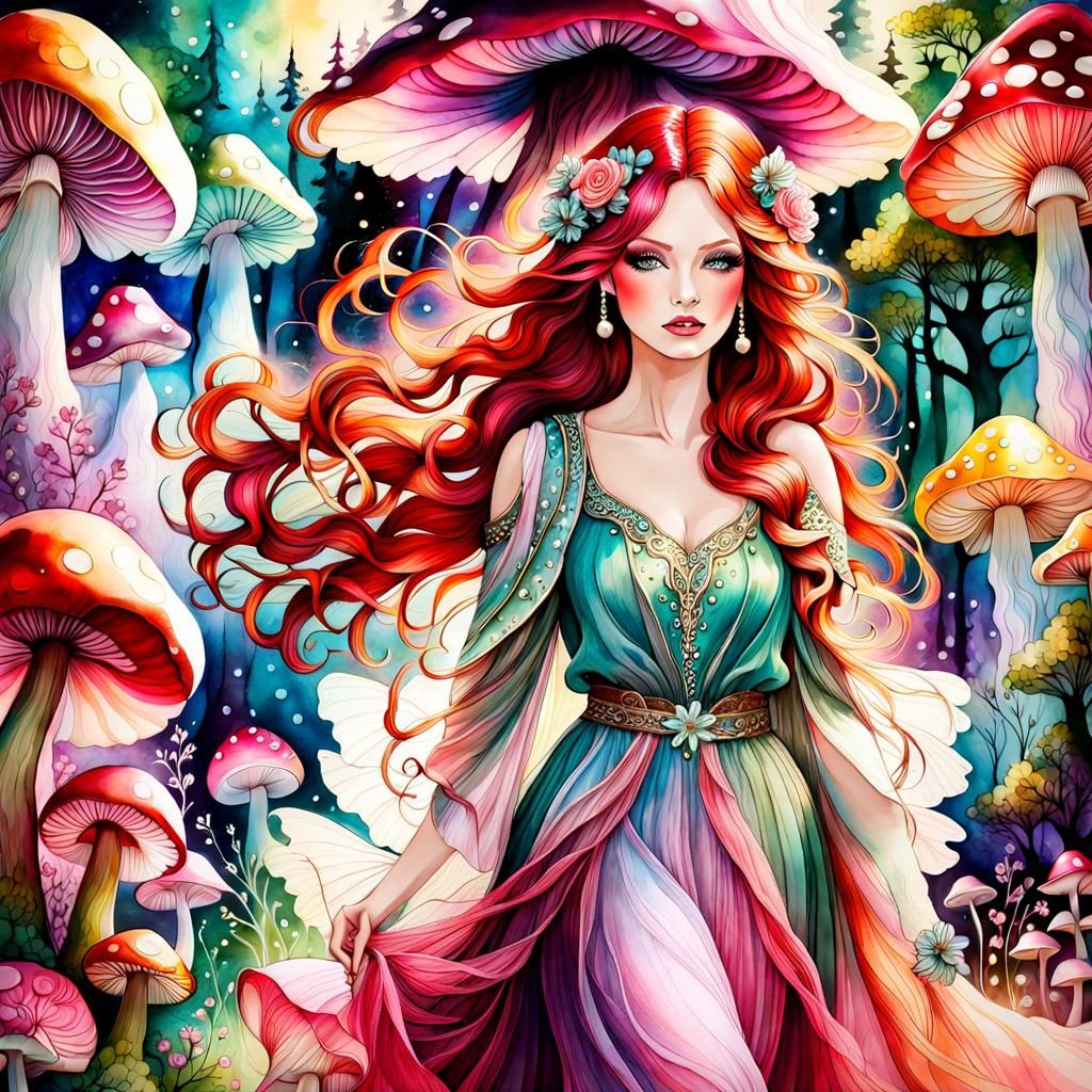 A vibrant fairy forest scene with mushrooms and a red-haired fairy. The fairy wears a silk dress with floral accents, rendered with flowing lines and pastel colors in psychedelic art style.
