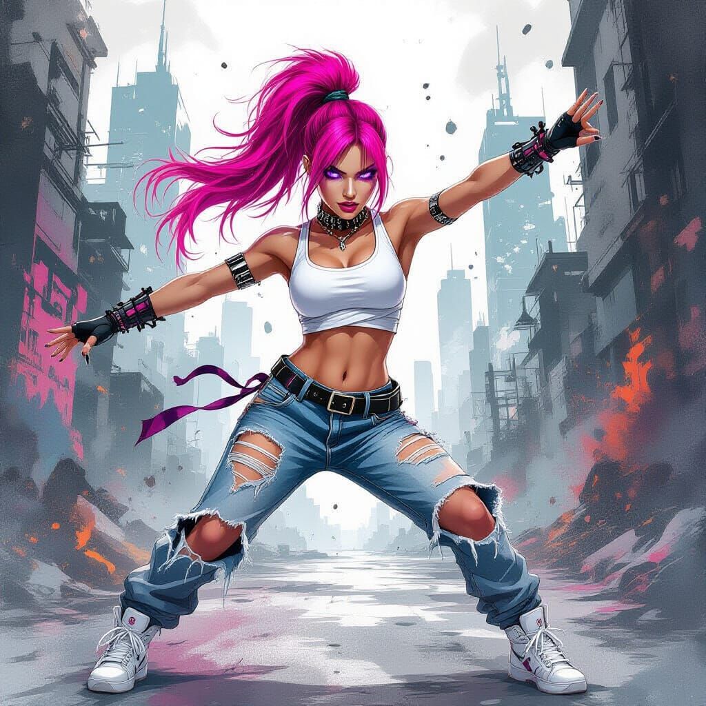 A vibrant watercolor painting of a strong female dancer with pink hair, performing in an urban setting. The artwork features a bold, abstract aesthetic in a gothic, sporty style.