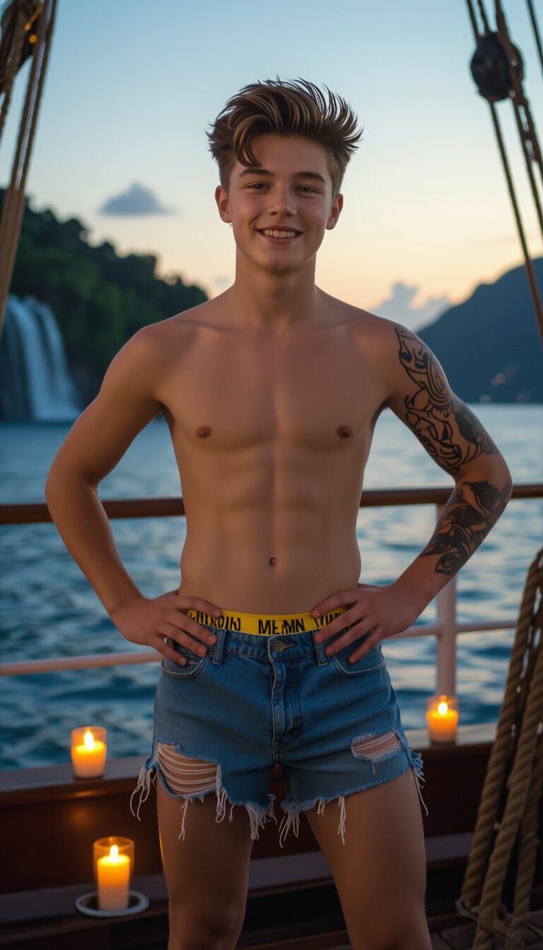A striking image of a stylish 16-year-old boy on a ship deck at night. The dramatic lighting and romantic backdrop create a cinematic atmosphere, evoking a film noir aesthetic.