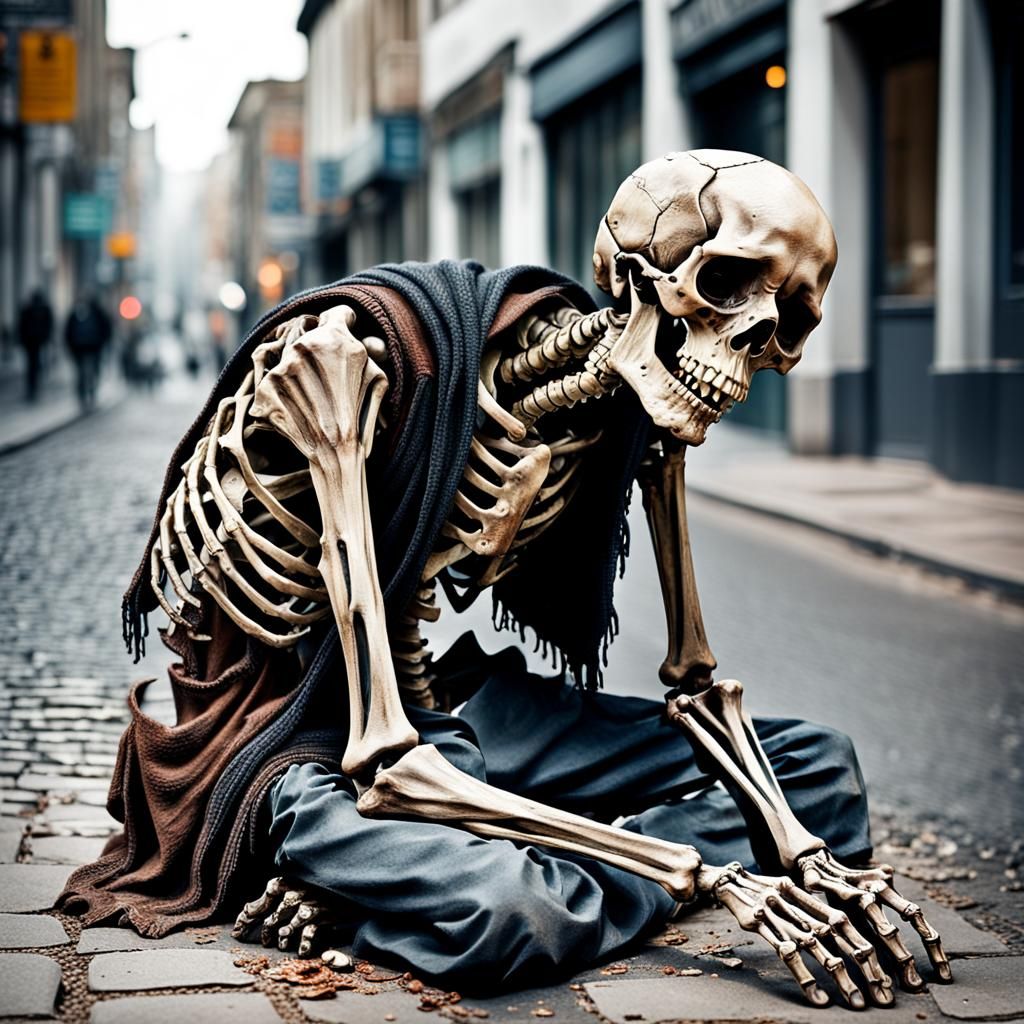 This image shows a sorrowful skeleton beggar on a city street, hand outstretched. The close-up view and emphasized emotions convey melancholy and despair in a photorealistic style.