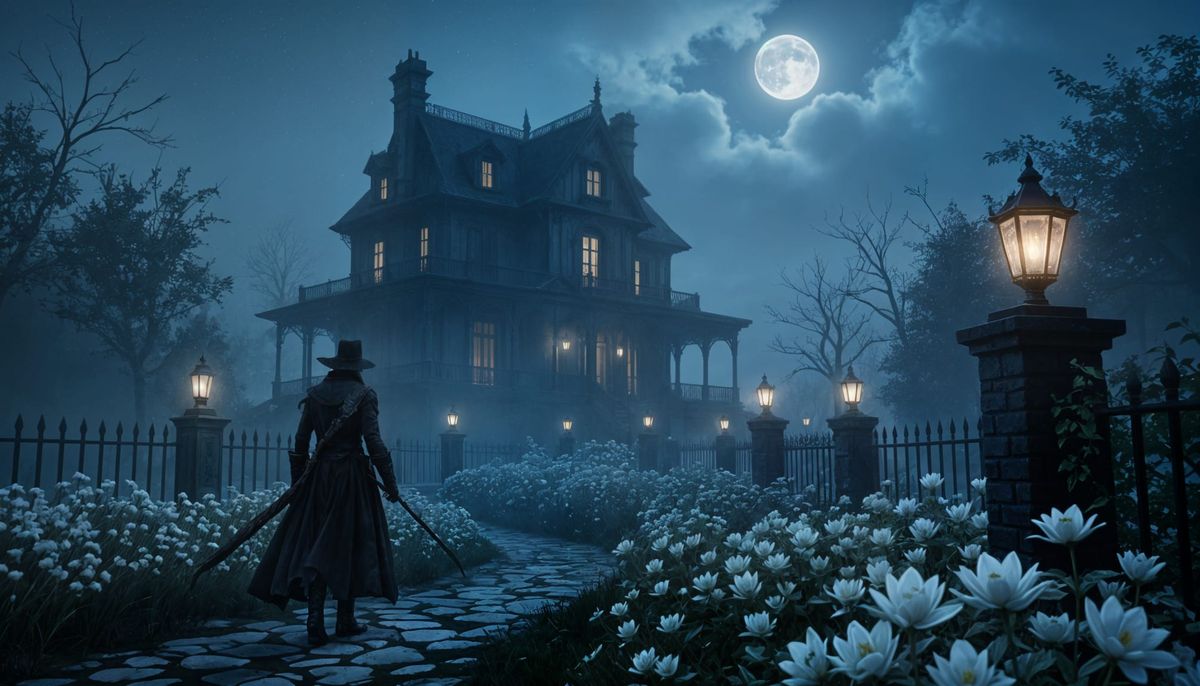 This image shows a gothic Victorian house surrounded by a misty garden with glowing lanterns. The scene evokes a serene yet eerie atmosphere, rendered with photorealistic textures and a dark fantasy horror aesthetic.