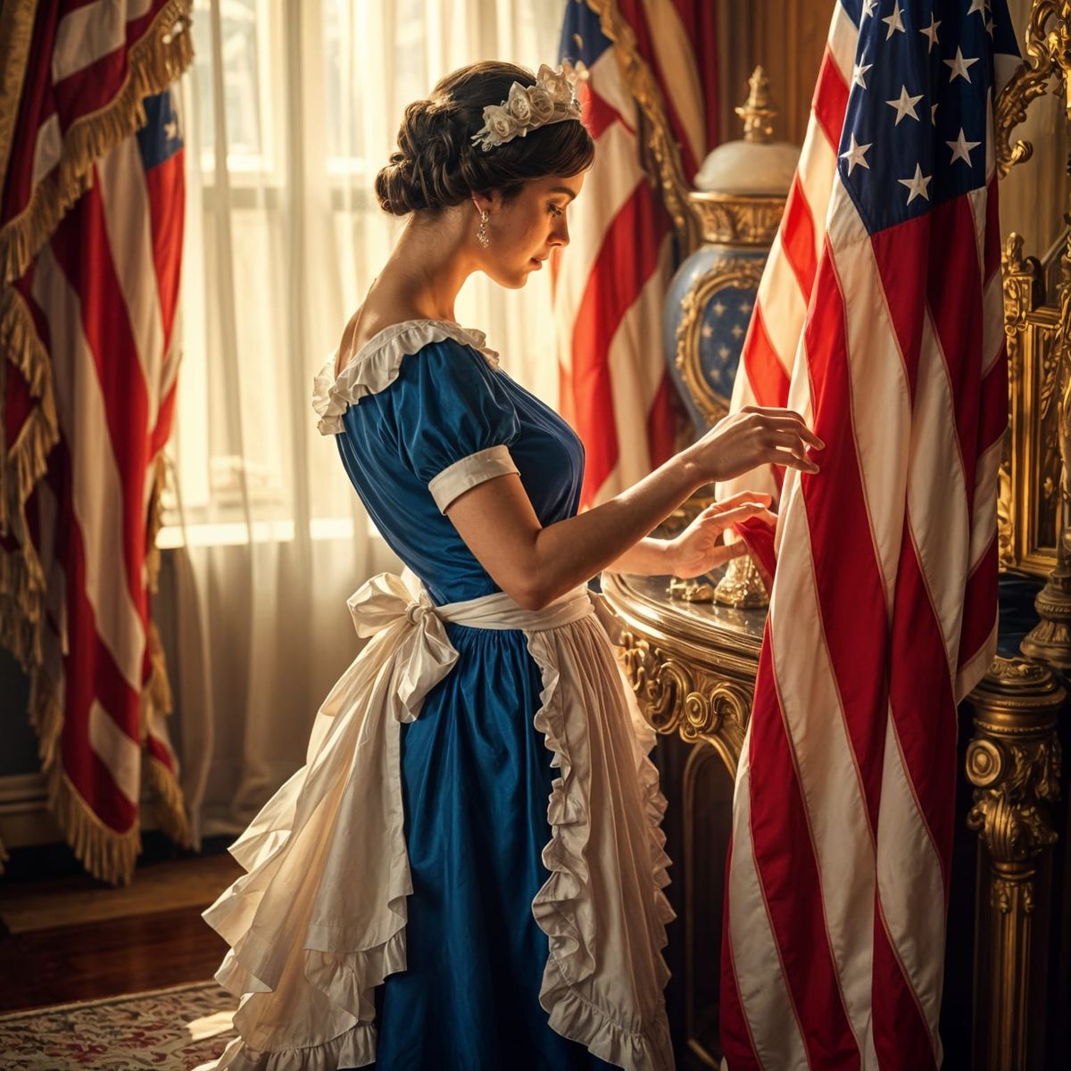 This image showcases a stunning woman in a red, white, and blue French maid's costume, surrounded by American flags, in a beautiful Art Deco style, with vibrant colors and cinematic lighting, reminiscent of a film still.