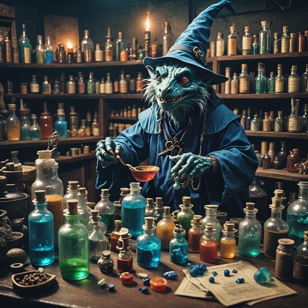 A dramatic image of a blue kobold wizard amidst a collection of potions and vials. The scene is lit cinematically and rendered with a film grain effect.