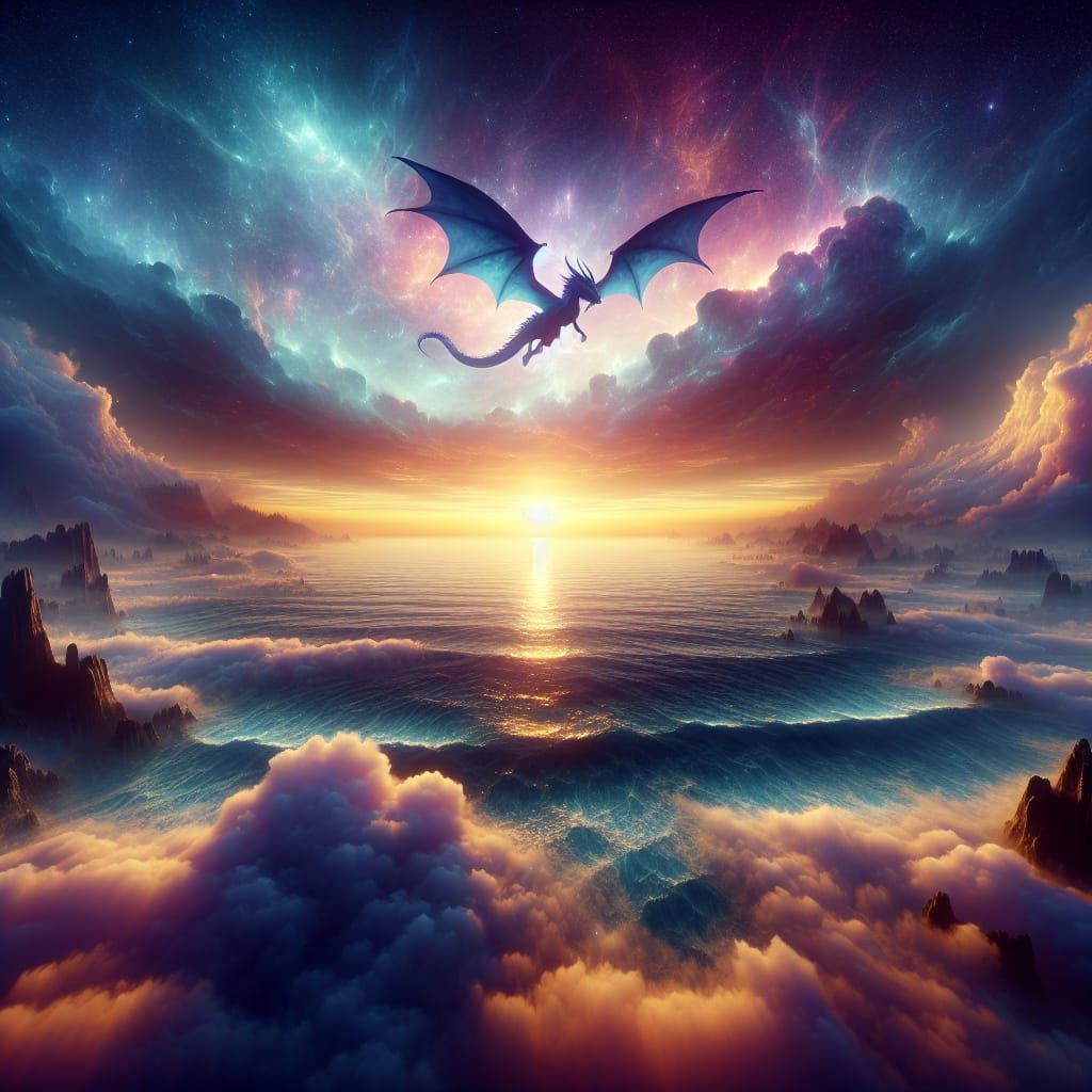 A vibrant seascape at sunrise features a dragon in flight. The digital matte painting showcases rich, deep colors and intricate details, reminiscent of fantasy art on ArtStation.