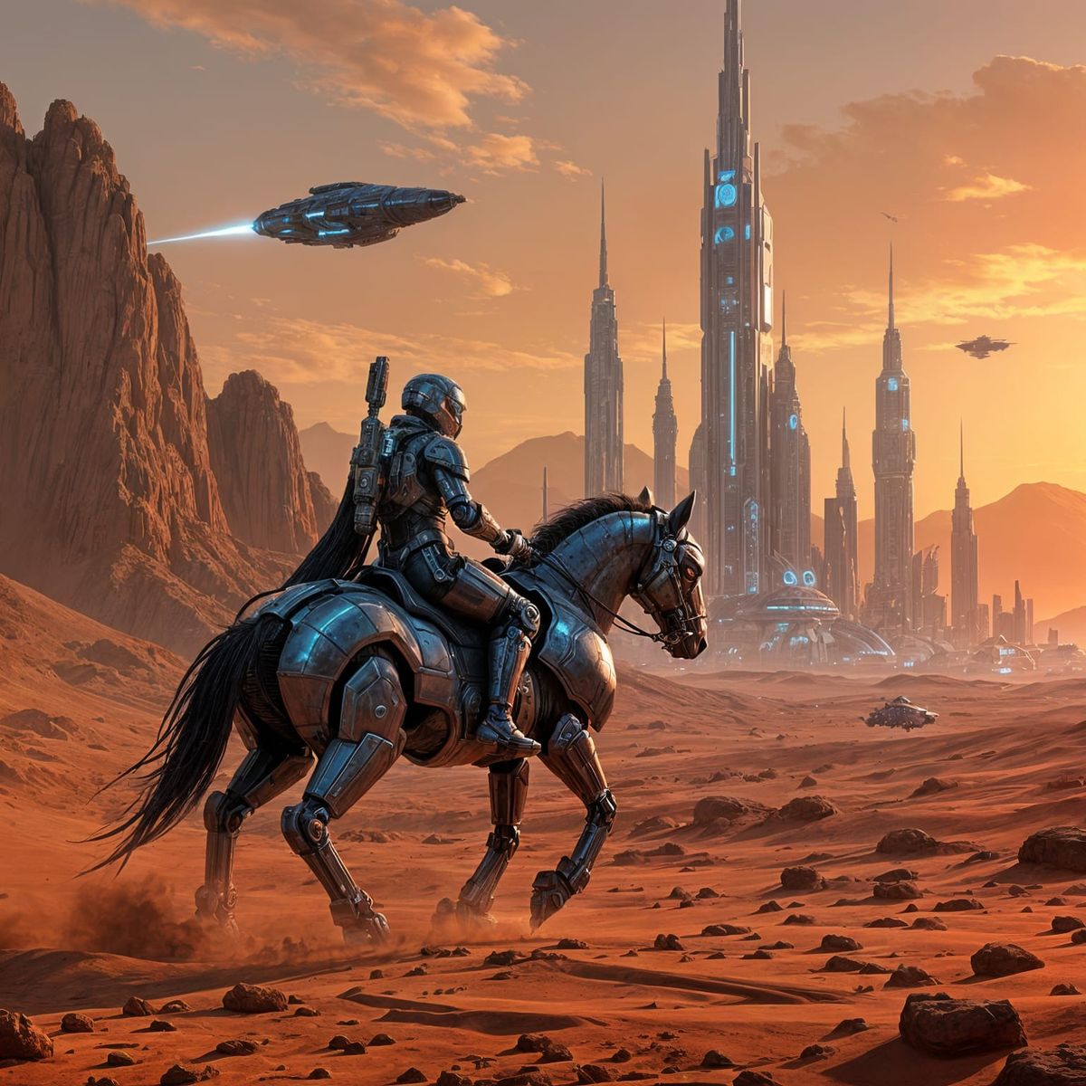 A resolute and determined futuristic bounty-hunter, clad in dark, reinforced armor with glowing blue accents, rides a sleek, metallic robotic horse onto a desolate, red-infused Martian wasteland. A shining, bustling futuristic city. looms in the background, a beacon of advanced technology complete with flying vehicles and towering spire-topped buildings. The city is illuminated in electro-blues and draped in shadowy grays, starkly contrasting with the Mars's bleak and lonely reds ...