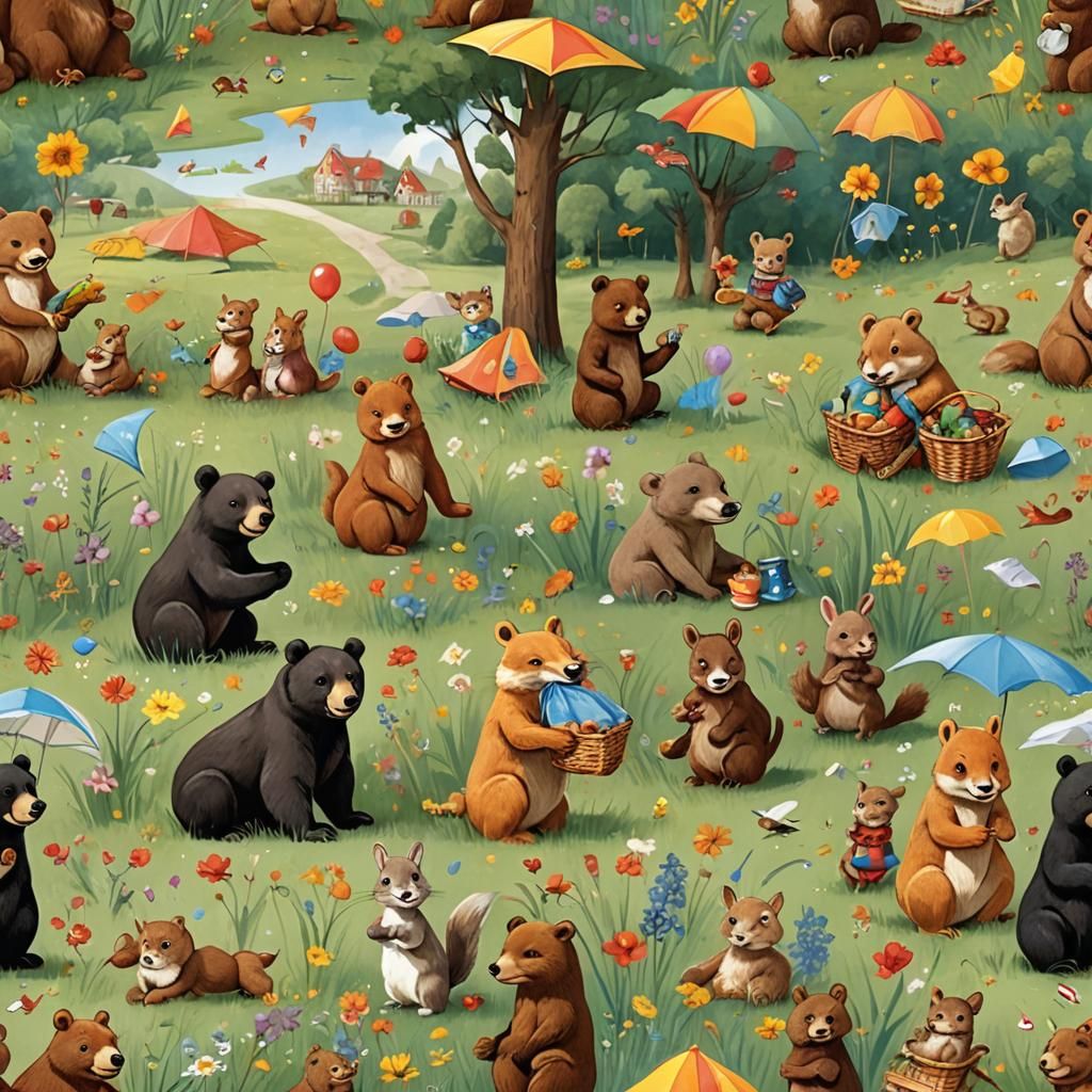 A vibrant illustration of friendly woodland creatures at a picnic. This image shows bears, rabbits, mice and squirrels enjoying playful activities rendered with expressive faces in a whimsical children's illustration style.