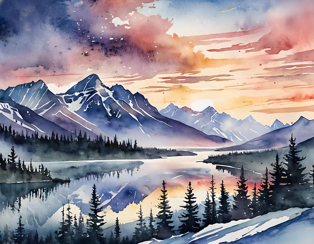 This image shows a vibrant sunrise scene in the Canadian Rockies, rendered as a watercolour painting. The artwork captures the serene beauty of the mountain landscape.