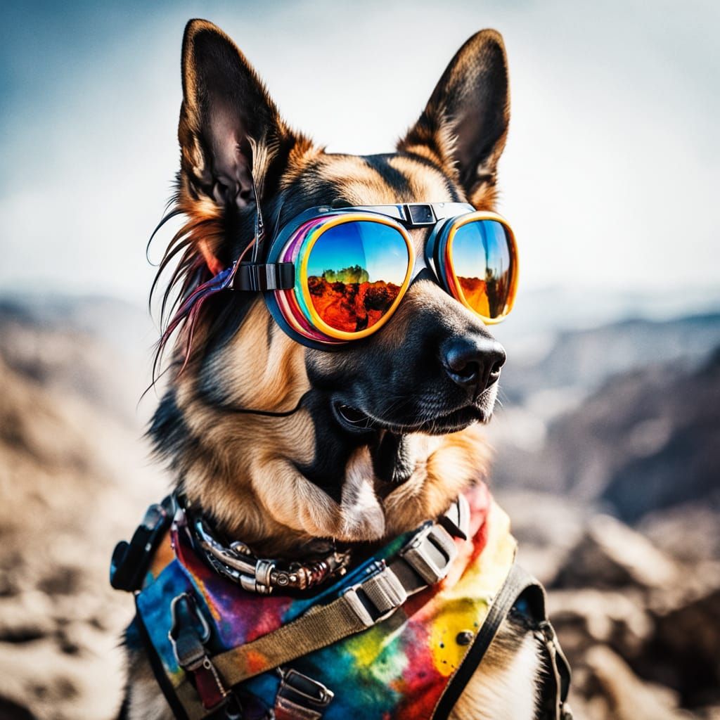 A German Shepherd wearing colorful goggles sits quietly, ready for action.