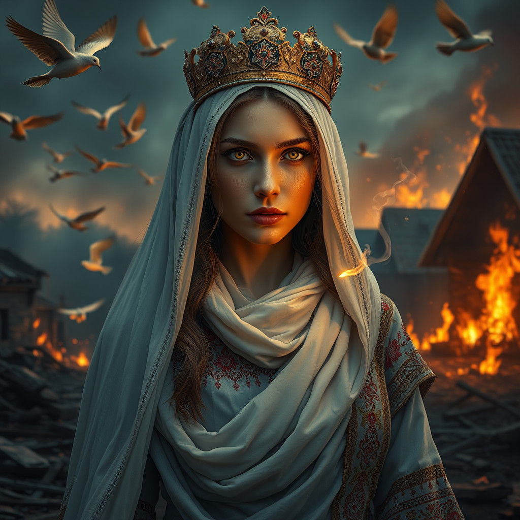 A striking picture of a Ukrainian princess amidst a burning village at night. Dressed in traditional clothing, she defiantly lights a cigarette as fiery doves fill the sky, rendered as a detailed matte painting.
