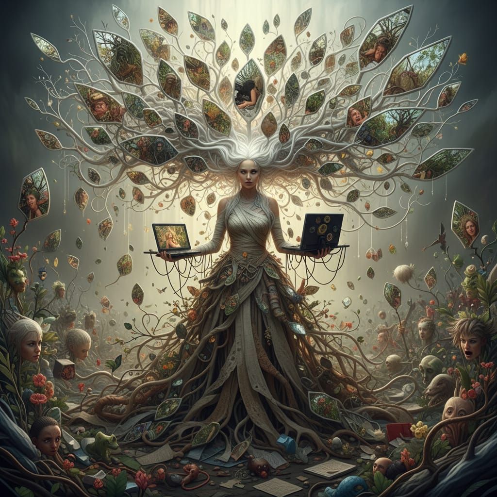 mirrors on nature mock her embodied ivory-white hair like scaffolding holds a series of recursive wild mirrors climbing up and around her fibre optic hair-strands in layered hollowness reflecting the futility of Mummy trying to write this prompt right now pull back into a wide angle wild angle full-length ...