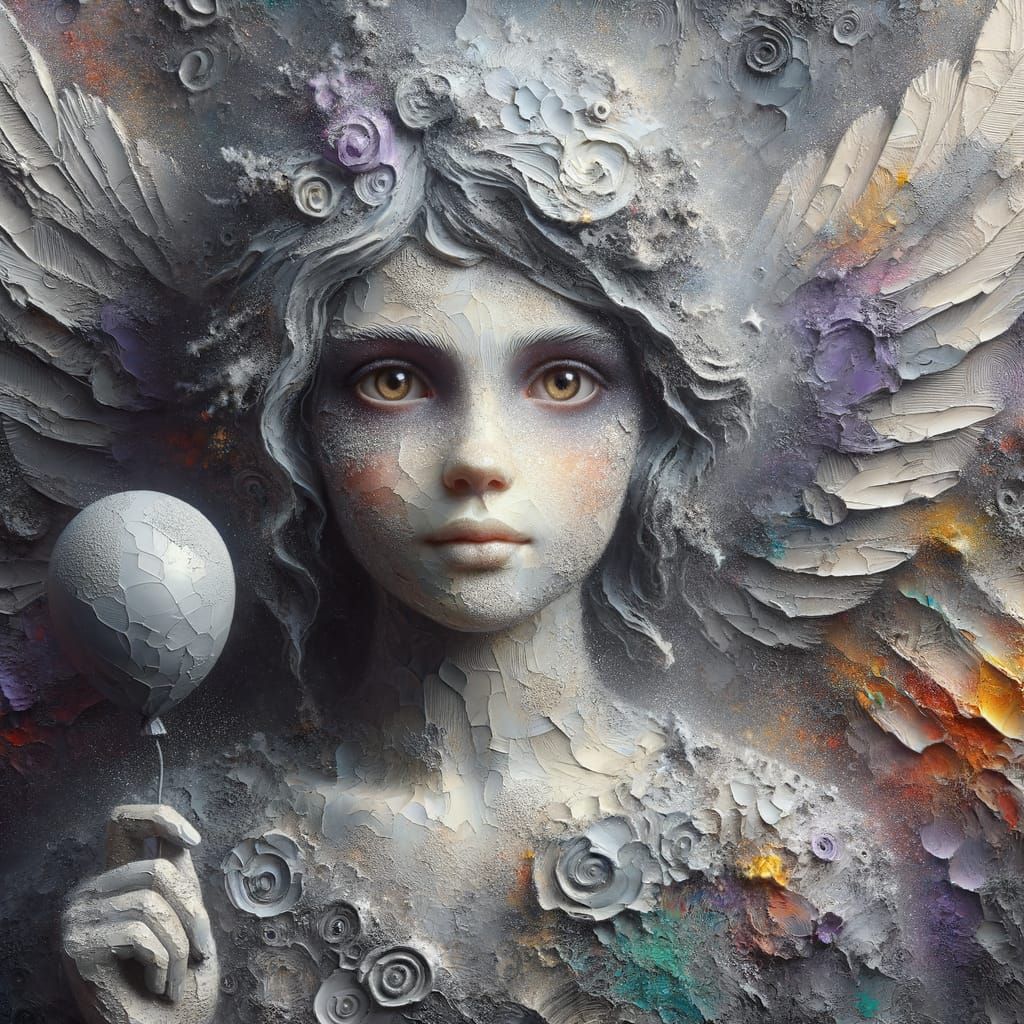 A striking picture of a mystical woman made of ash holding a balloon. The image is rendered with vibrant impasto techniques, pronounced brush strokes, and volumetric accents in the style of pre-1912 abstract expressionism.