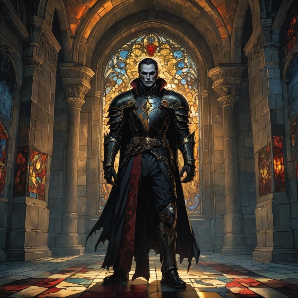 This image shows an armored vampire in a mausoleum, rendered in a dark fantasy style. Golden hour light filters through stained glass, casting eerie patterns. The scene evokes a mystical and macabre atmosphere.