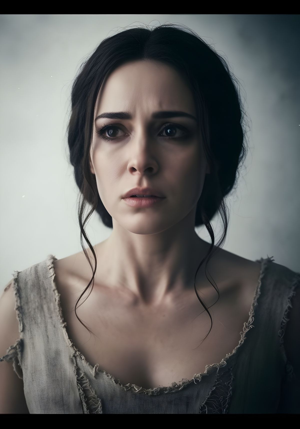 This image shows a woman with a beautiful, melancholic expression and a tattered dress, set against a misty background. The image has a cinematic quality, reminiscent of a film still.