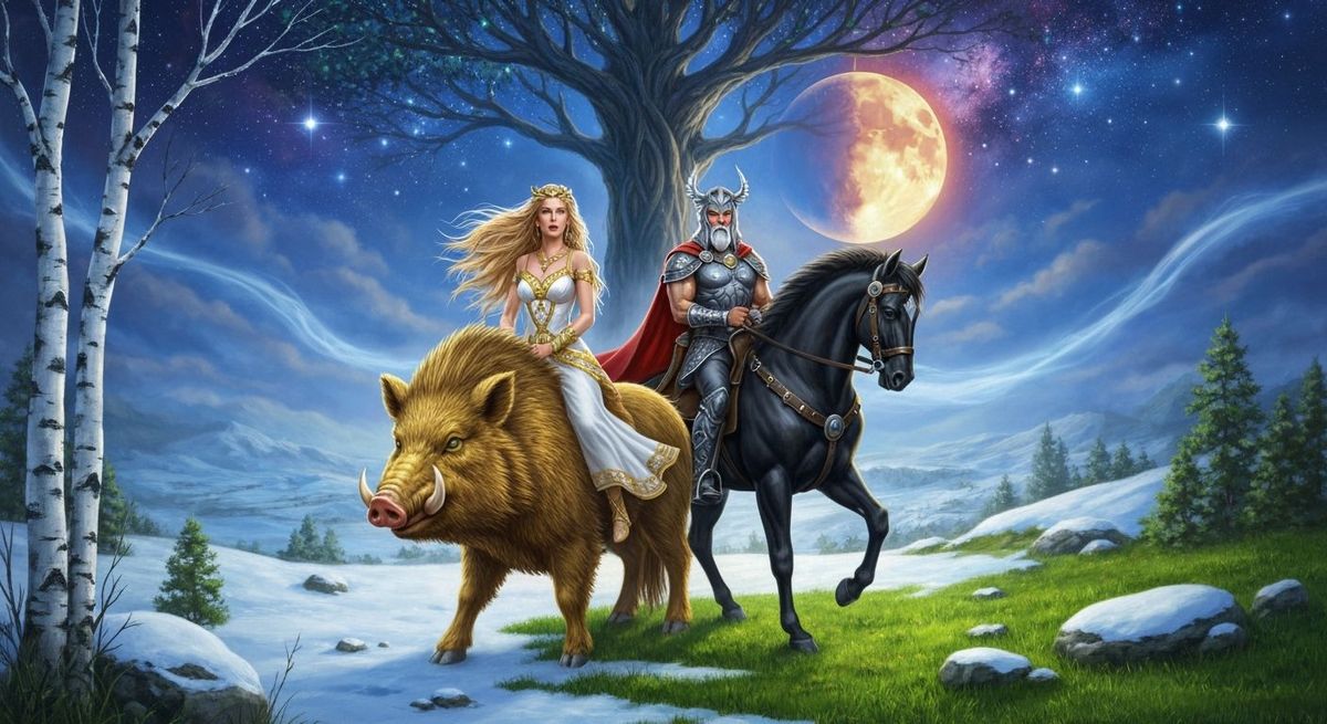 This hyperrealistic splash art depicts Norse gods Freyja and Odin on their mounts against a mystical backdrop of a half sun/half moon and Yggdrasil. Featuring a dramatic blend of light and shadow.