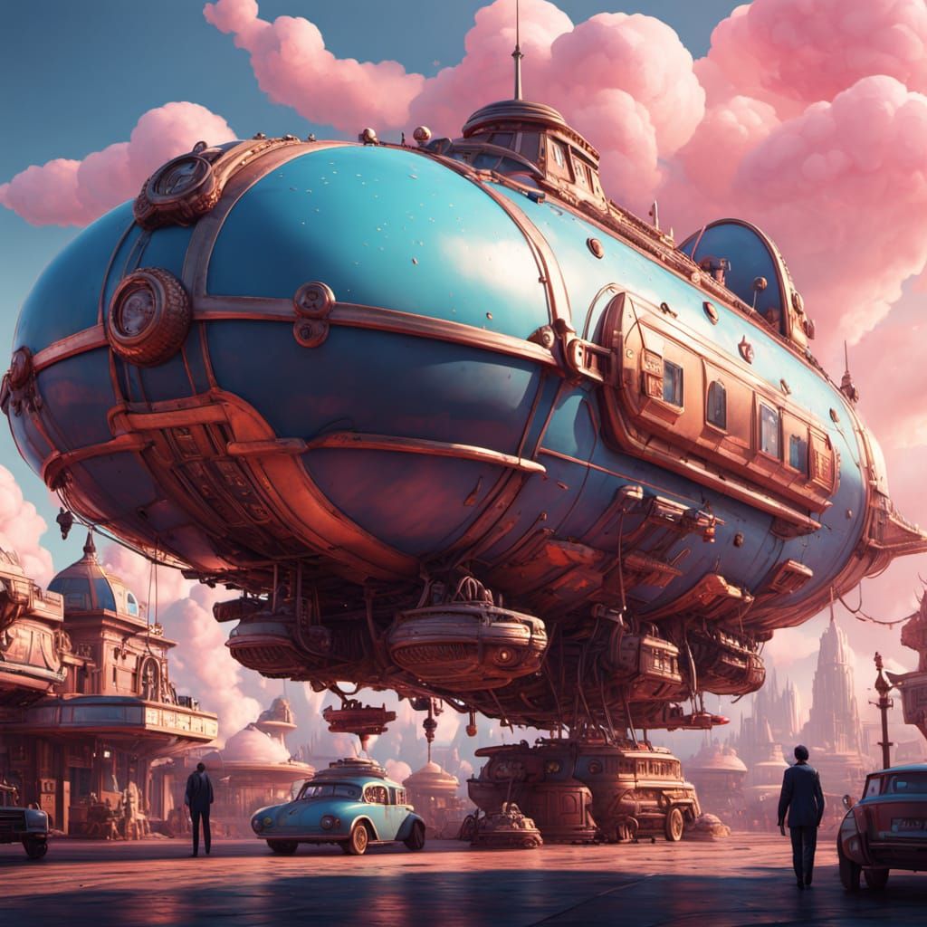 This image shows a retro-futuristic airship designed as a 1950s-style cotton candy shop. The image is rendered with intricate mechanical details, polished metal, and vibrant colors, in a cinematic style.