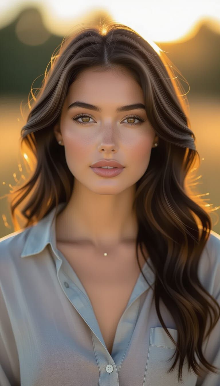 A glowing 16K photoreal portrait of a young woman bathed in golden hour light. Her wavy dark hair catches the warm highlights, her eyes reflect the sunset, and her natural beauty shines through in crystal clarity. Perfect for high-resolution portraits, wallpapers, and editorial-style inspiration.
