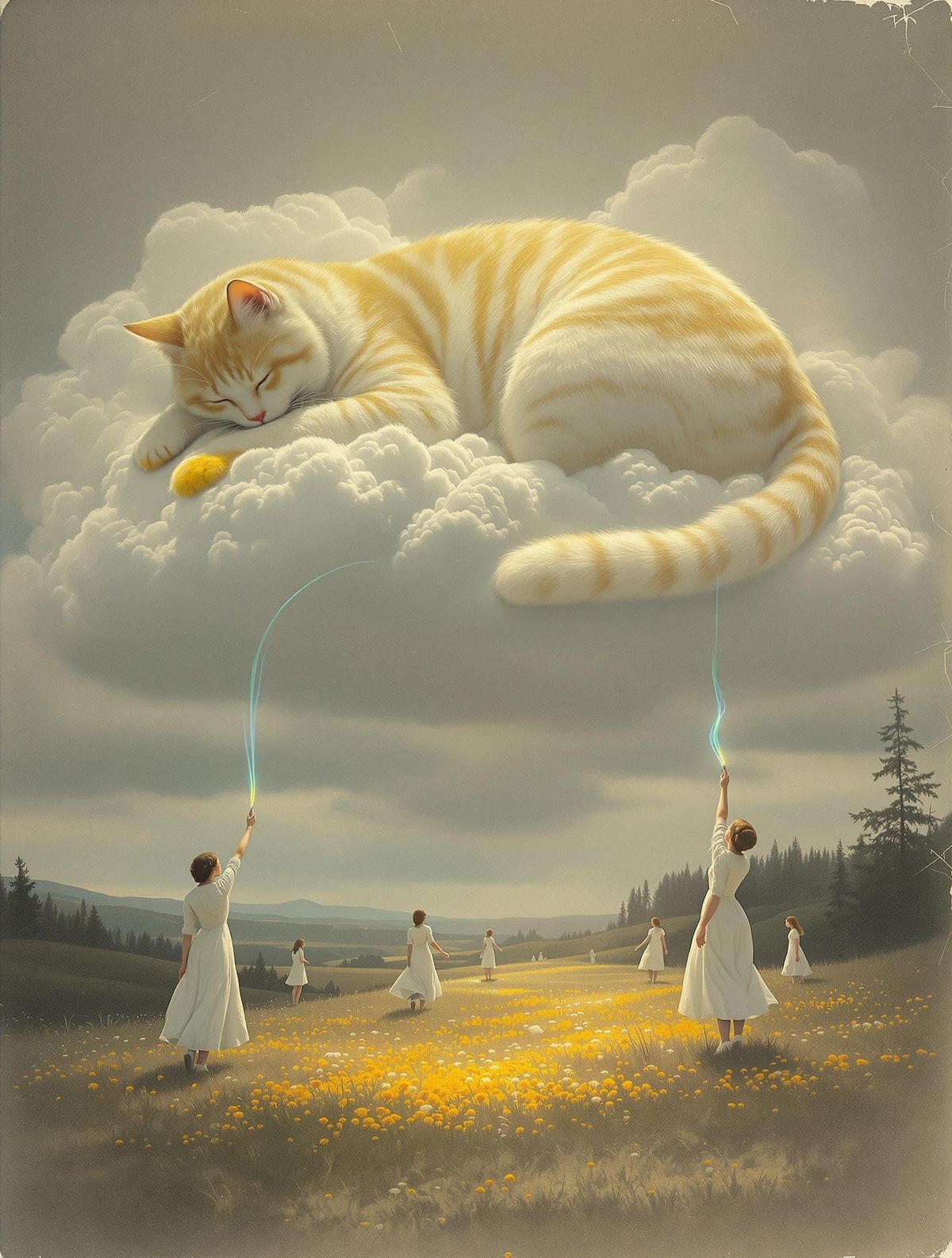 Lofnβs Prompt: An surreal and amusing old photograph of a giant fluffy cat in a cleverly unreal situation.