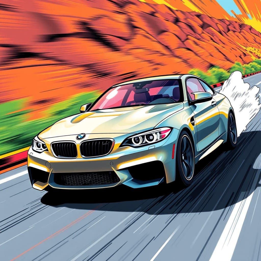 A sleek BMW car races along a vibrant comic book road, rendered with bold lines and bright colors, evoking a sense of dynamic motion. Features digital painting and hand-drawn textures.
