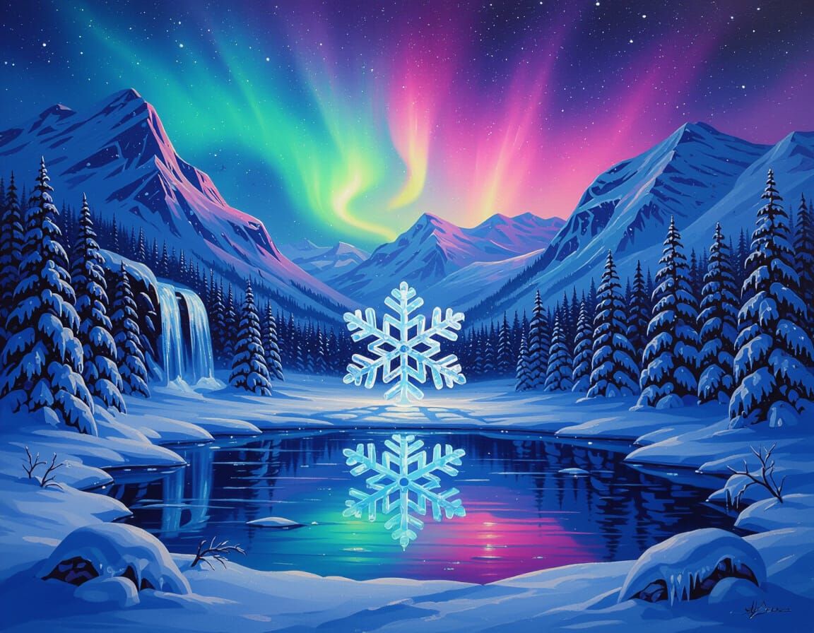 This image showcases a stunning oil painting of a winter scene, featuring a waterfall flowing into a pond under a sky lit by colorful northern lights.