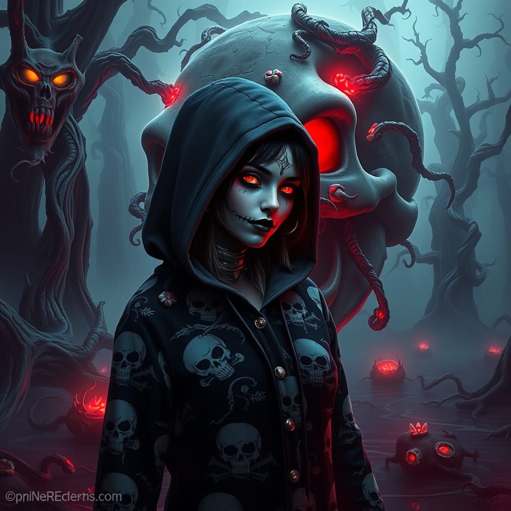 Young lady in hooded onesie deathcore fashion adorned with skull dtf prints, intricate overdone goth makeup, striking accessories, glowing neon red eyes, Infront of A colossal, ancient monster skull, overgrown with bioluminescent fungi and entwined with spectral vines, rests half-submerged in a misty, ...