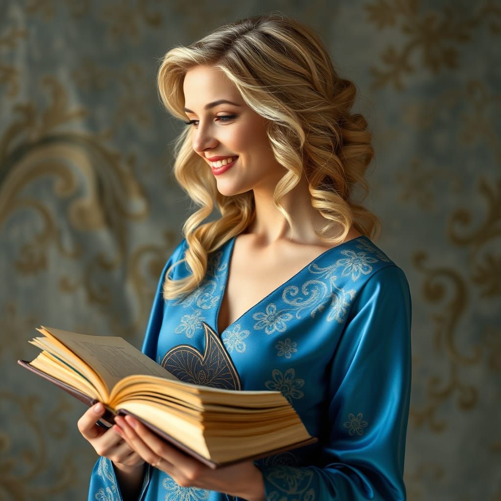 This image shows a beautiful blonde woman reading an ancient book with magical secrets, set in a whimsical Art Nouveau scene with delicate flowers and soft, sunny atmosphere.