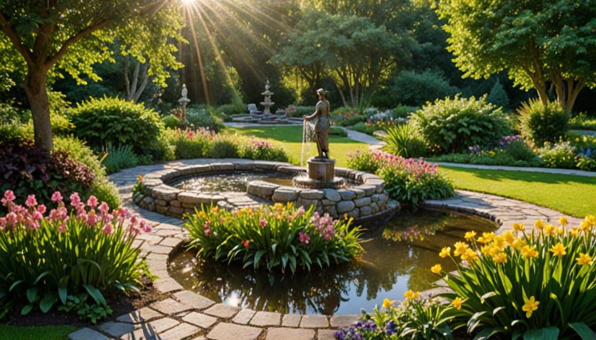 This image shows a garden with a water fountain and winding stone path. A woman stands in the pond on a bright, sunny afternoon, with sunrays filtering through the flowers.
